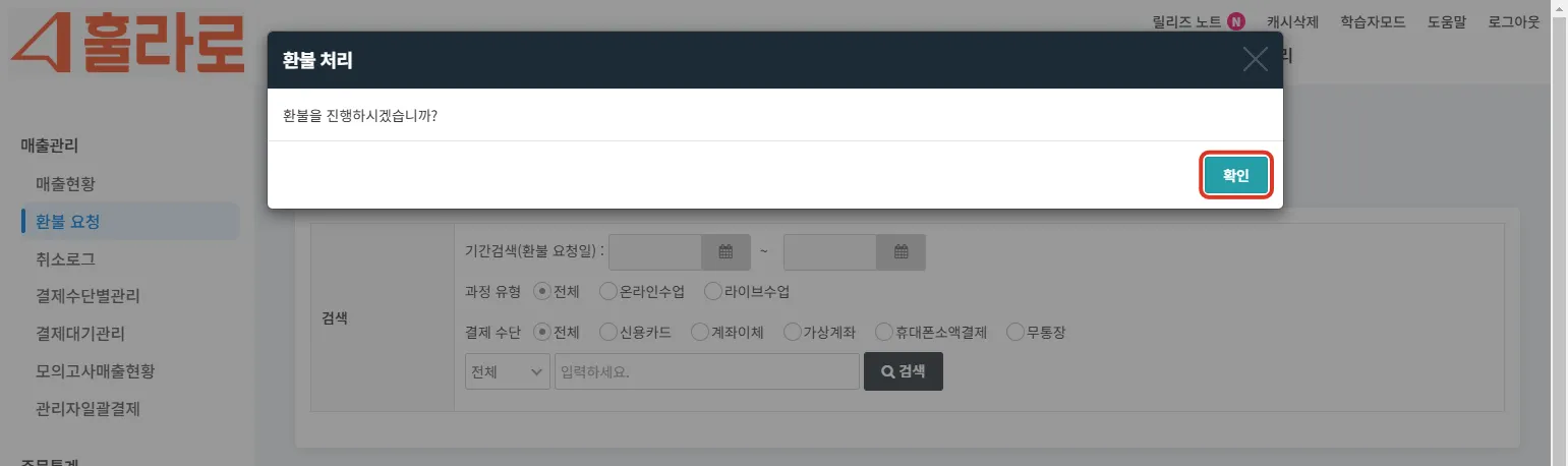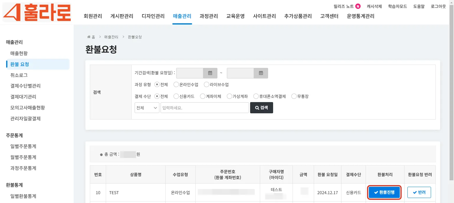 [매출관리 > 환불요청] 메뉴에서 [환불진행] 버튼을 클릭합니다.
