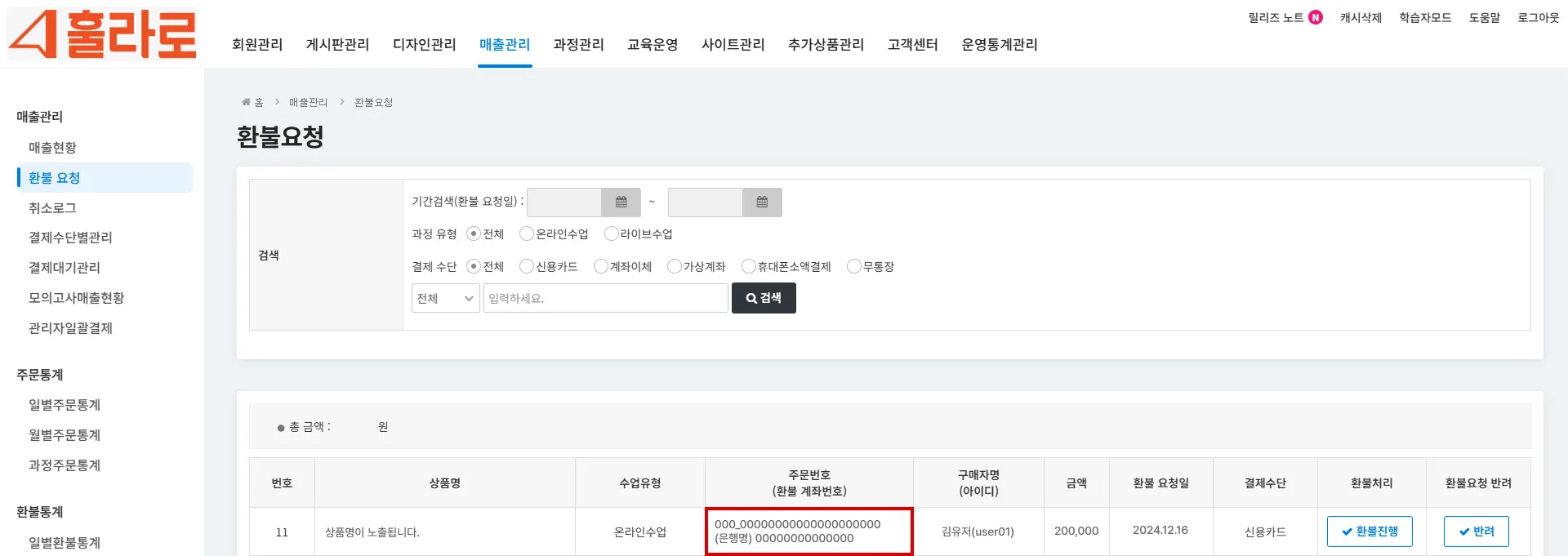 학습자가 결제 취소 신청 시 입력한 환불 계좌 정보가 있을 경우, 해당 계좌 정보가 주문번호 하단에 노출됩니다.