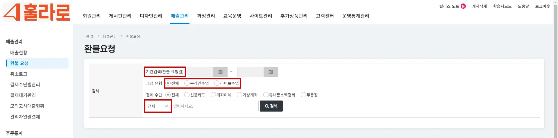 환불 요청 메뉴의 검색 필터 영역이 개선됩니다.
