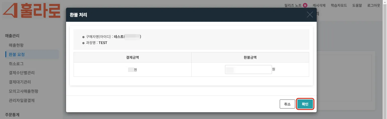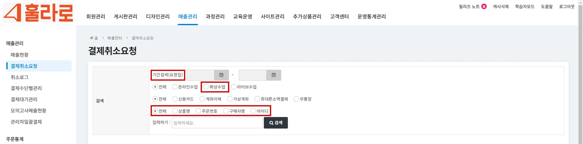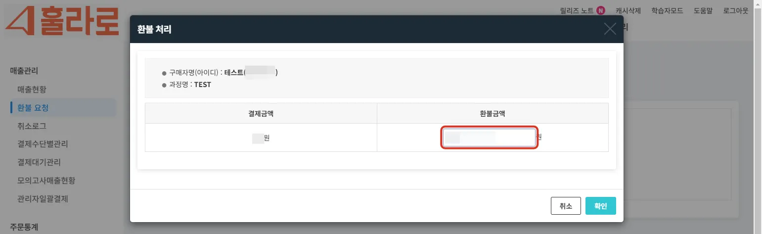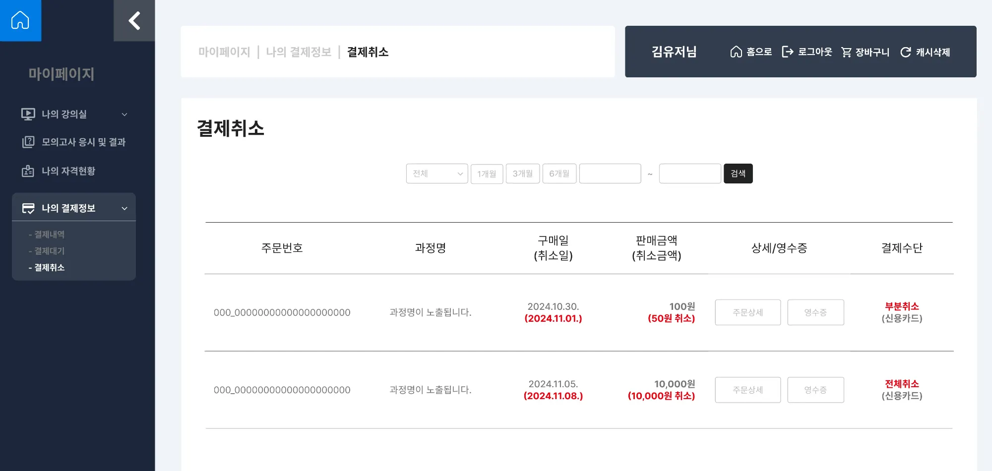 학습자 화면에서는 기존과 동일하게 [결제취소]라는 문구로 노출되며, 관리자 메뉴에서는 보다 직관적인 메뉴명으로 변경되었습니다.