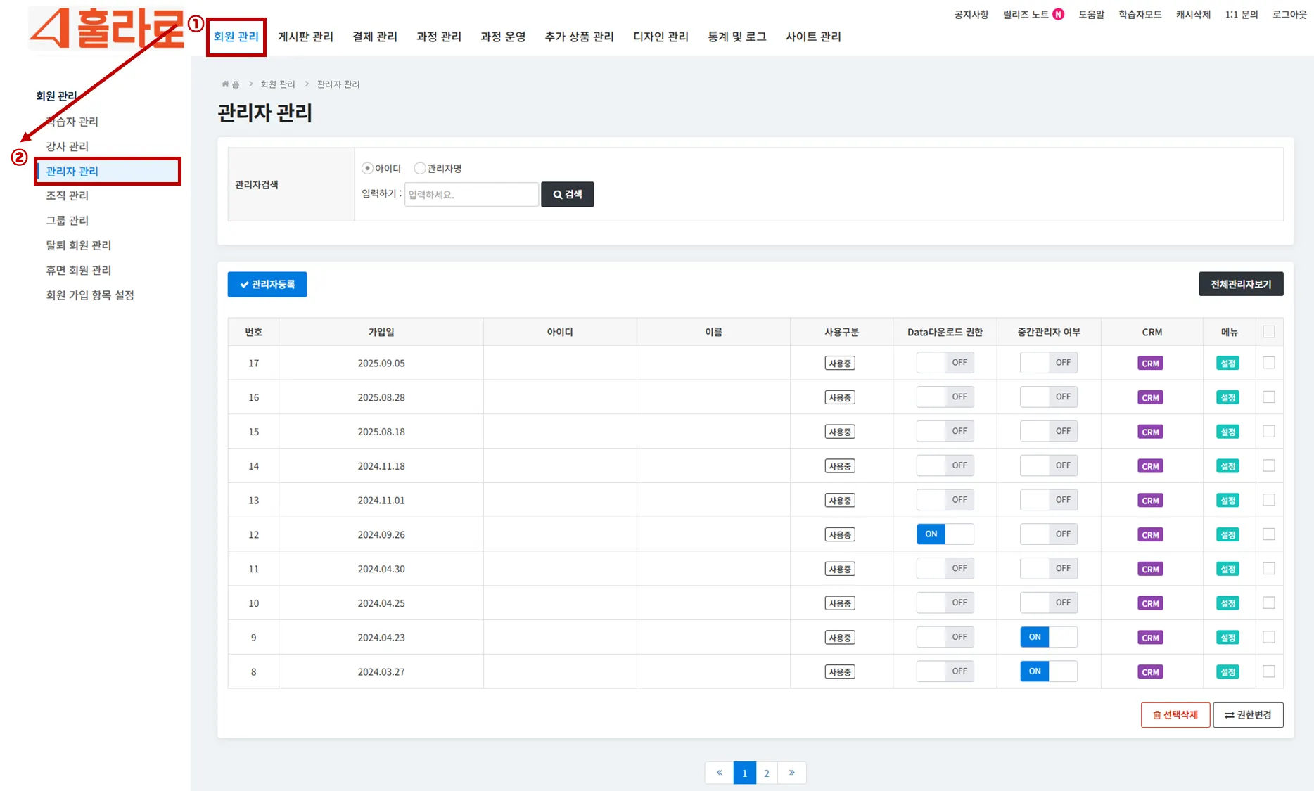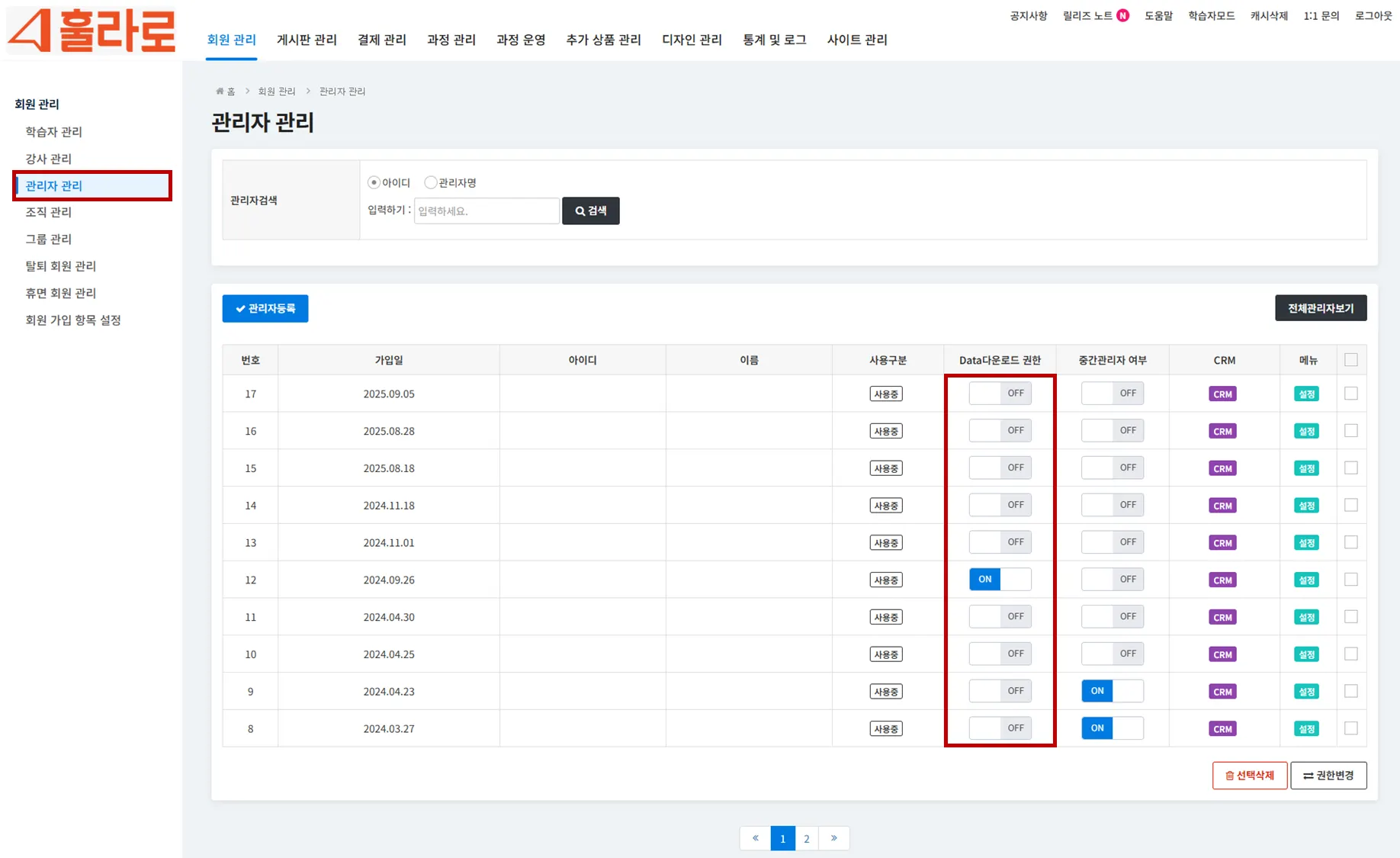 관리자 데이터 다운로드 권한은 전체 관리자 중 최대 2명까지만 설정할 수 있습니다.
