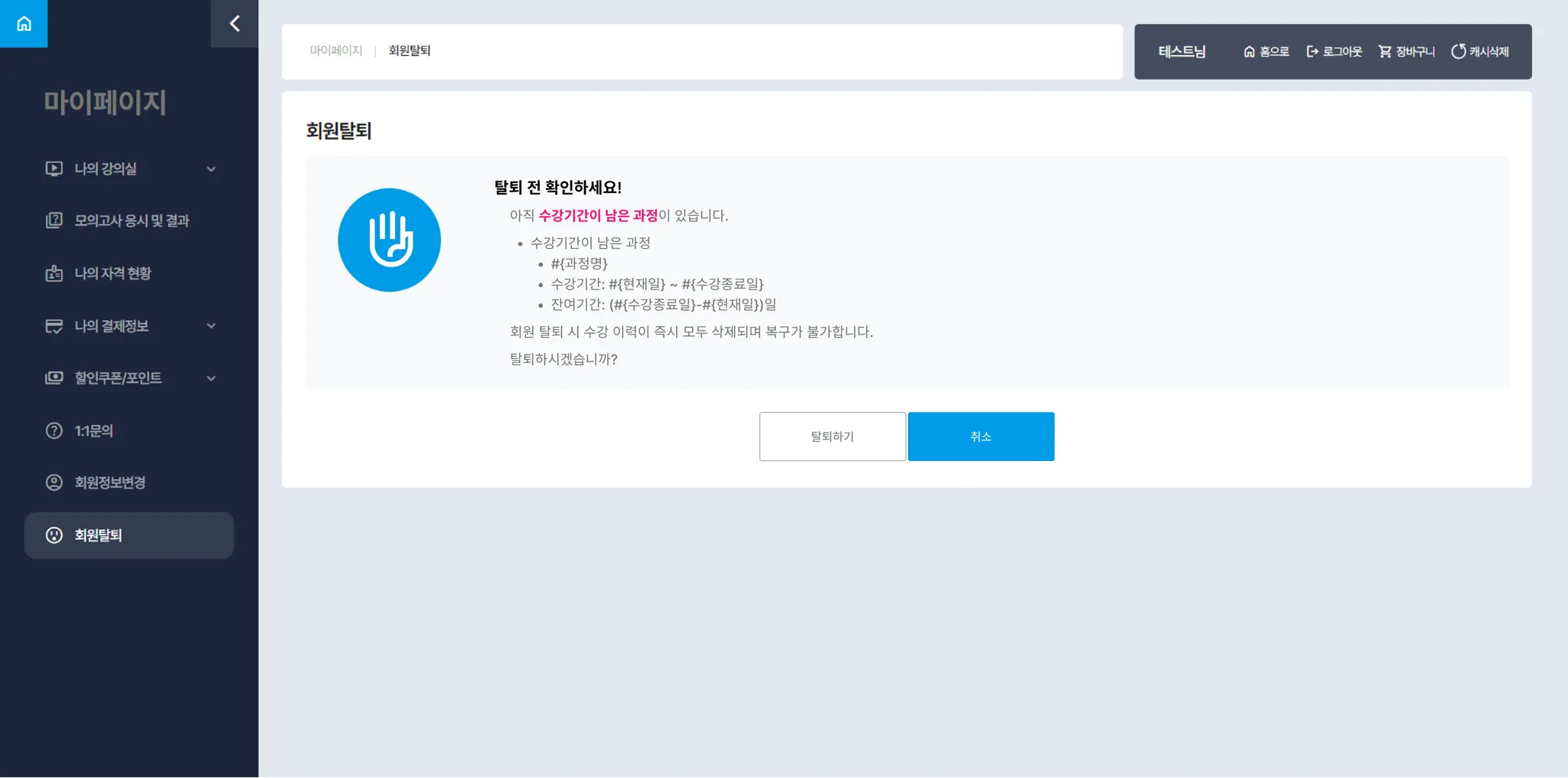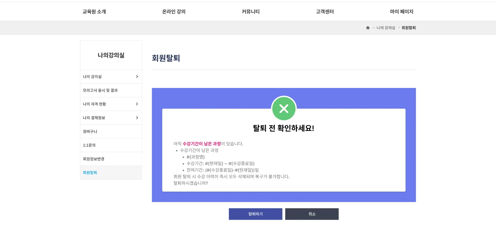 단, 수강하고 있는 과정이 없는 경우 노출되지 않습니다.[탈퇴 전 확인하세요!] 페이지에서는 수강 기간이 남은 과정의 과정명, 수강기간, 잔여기간을 보여주며 해당 부분을 학습자가 확인할 수 있도록 합니다.