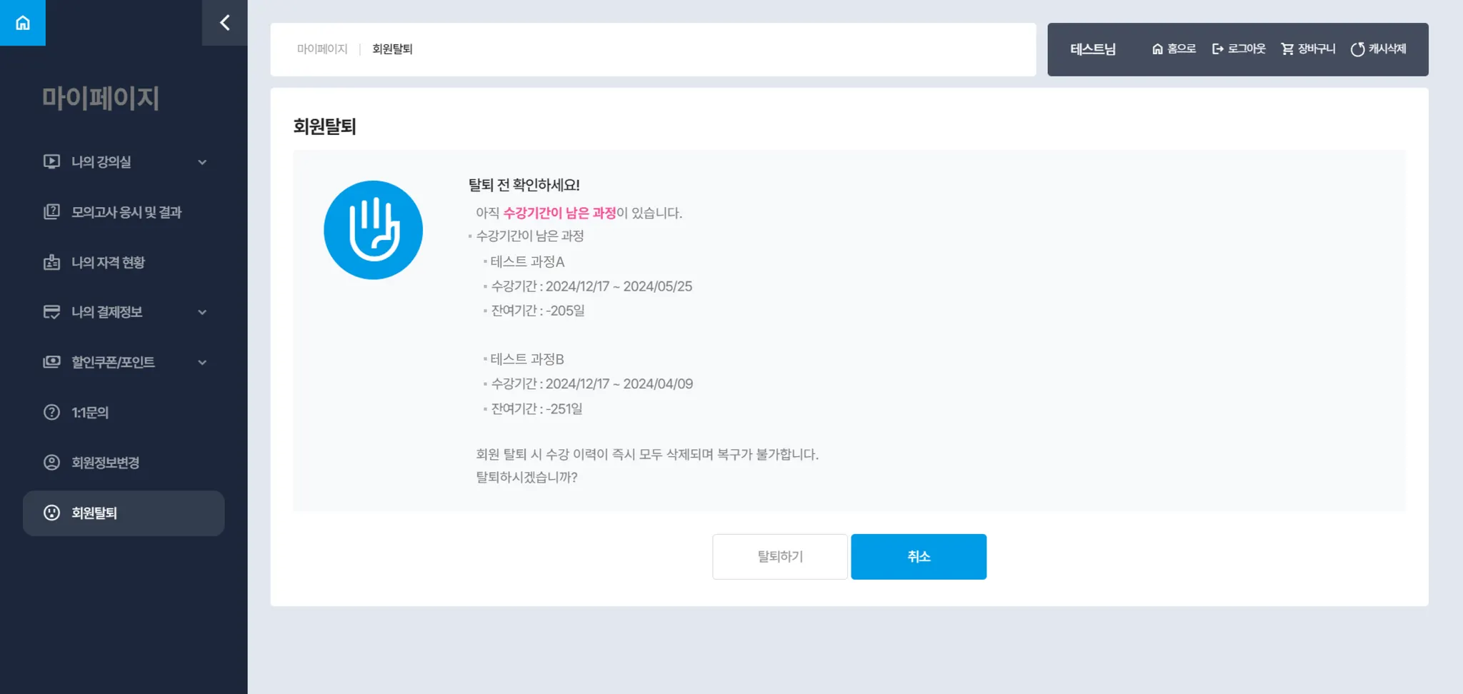 기존에는 수강중인 과정이 있는 경우 혹은 미수료한 과정이 있는 경우에는 회원 탈퇴가 진행되지 않았습니다.