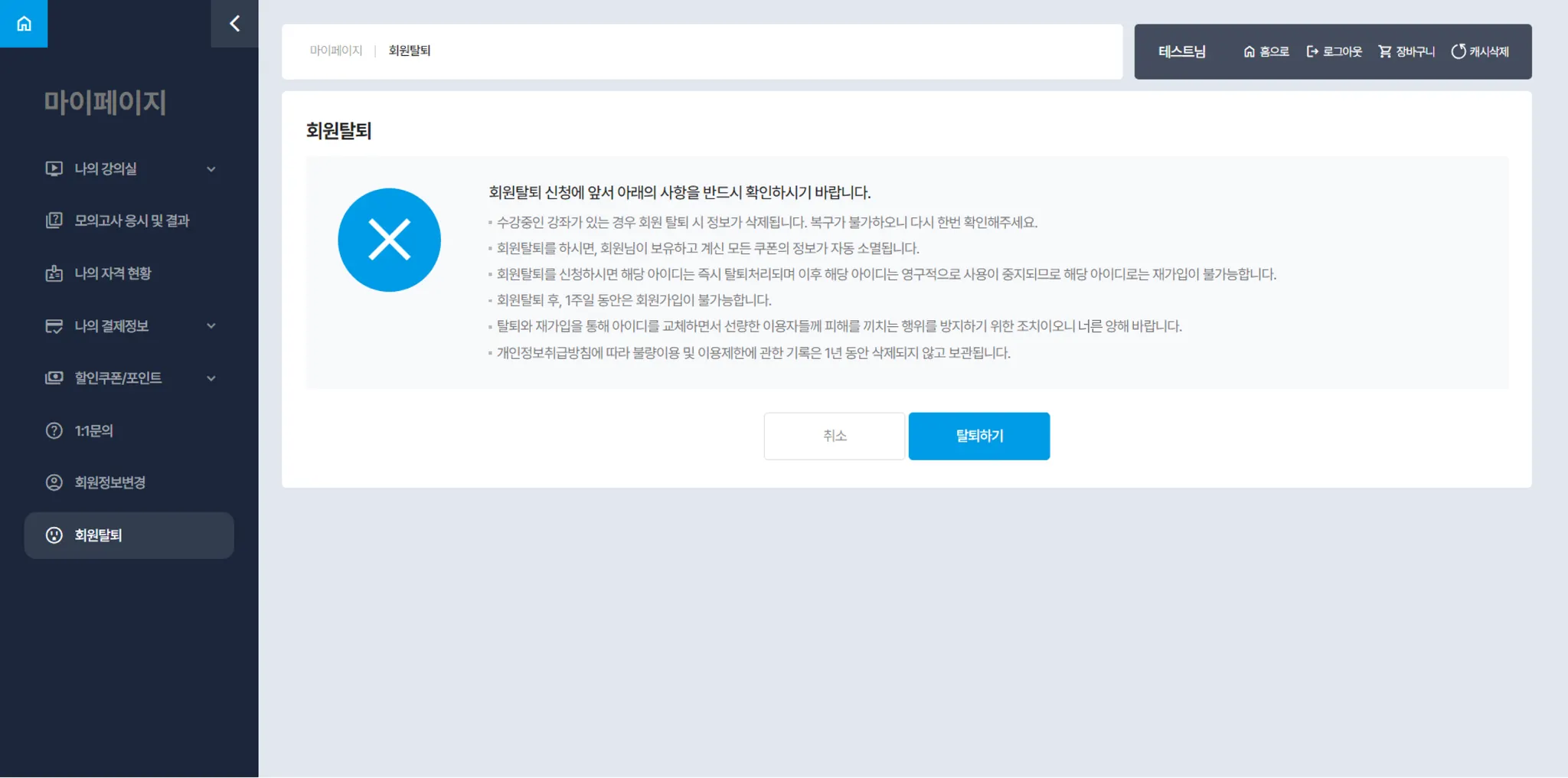 이번 업데이트를 통해 학습자가 희망하는 경우 회원 탈퇴가 가능하도록 변경되었으며, 이에 따른 회원 탈퇴 절차가 1단계 추가되었습니다.