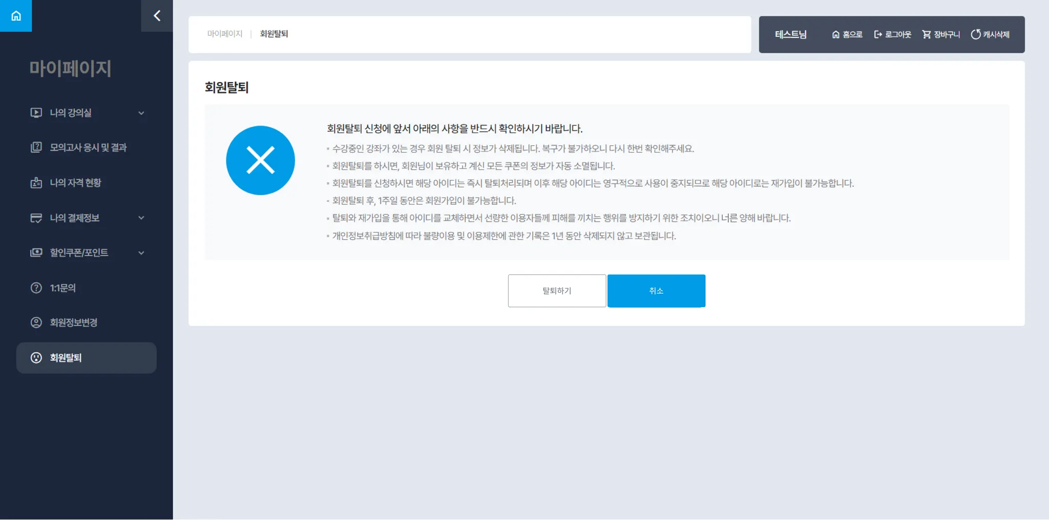 학습자는 직접 해당 내용을 확인 후 탈퇴하기 버튼을 클릭해야 탈퇴를 진행할 수 있습니다.
