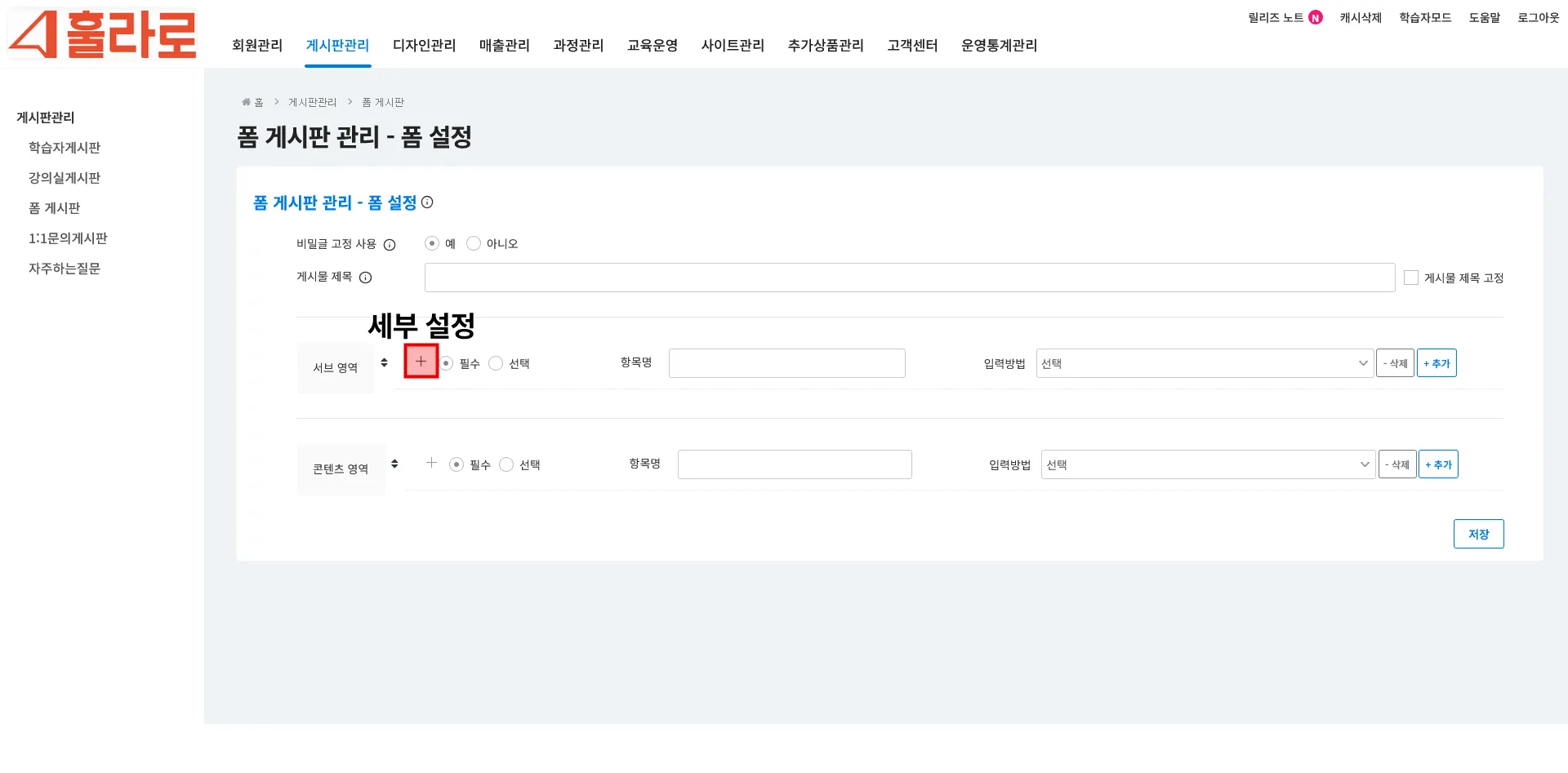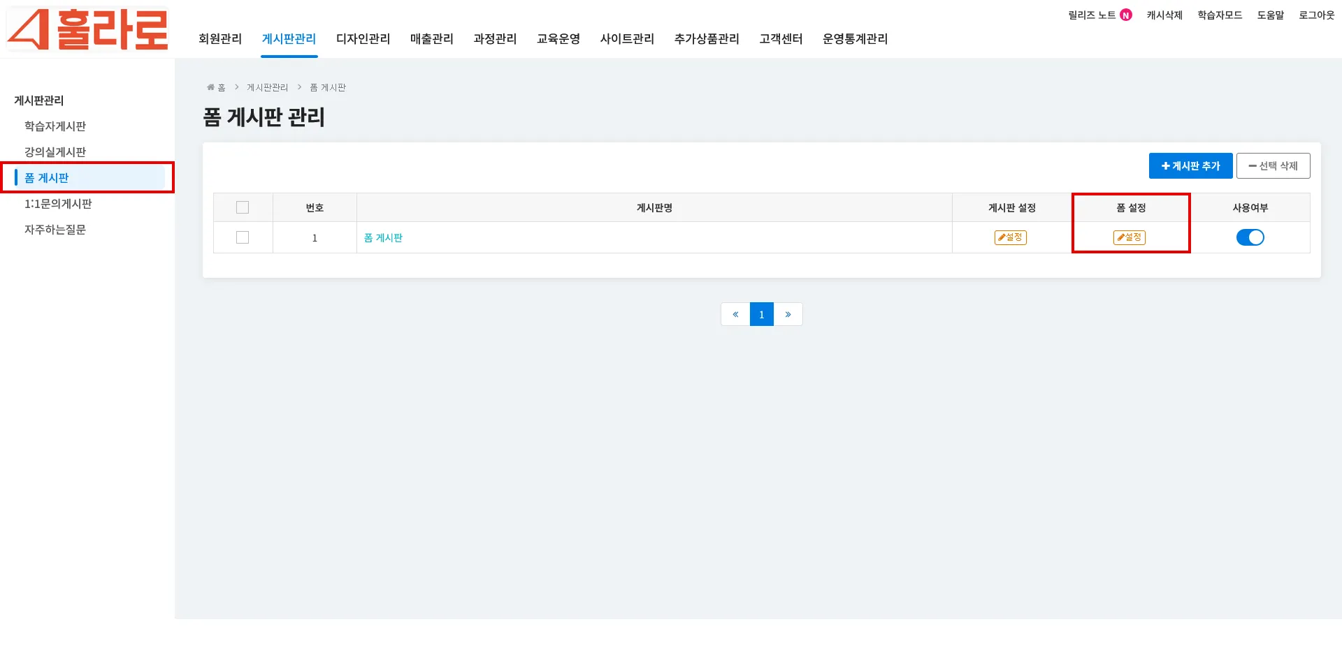 폼 게시판은 게시판 설정과는 별도로 폼 설정이 필요하므로, 해당 메뉴에서 개별 설정을 진행해야 합니다.